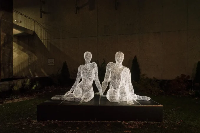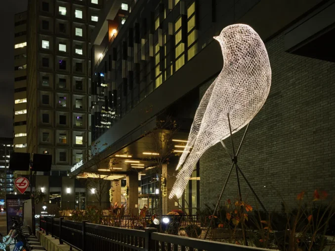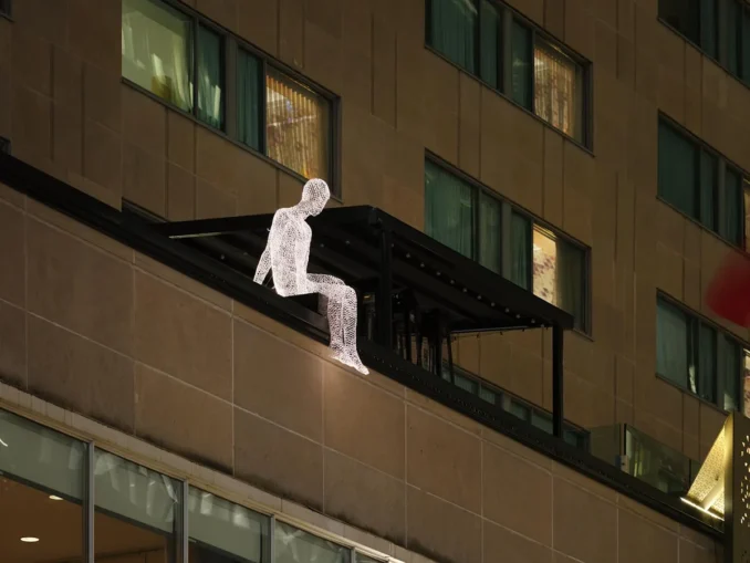 Les Voyageurs (Travellers) by Cédric Le Borgne features luminous figures floating over five downtown hotels: Hôtel HoneyRose Montréal, Fairmont The Queen Elizabeth, DoubleTree by Hilton Montréal, Montréal Marriott Château Champlain and Hyatt Place Montréal Centre-Ville, in collaboration with Tourisme Montréal and the Association hôtelière du Grand Montréal.