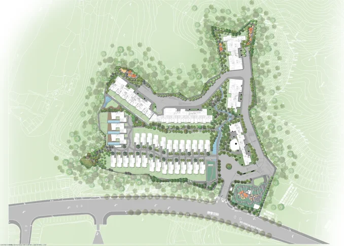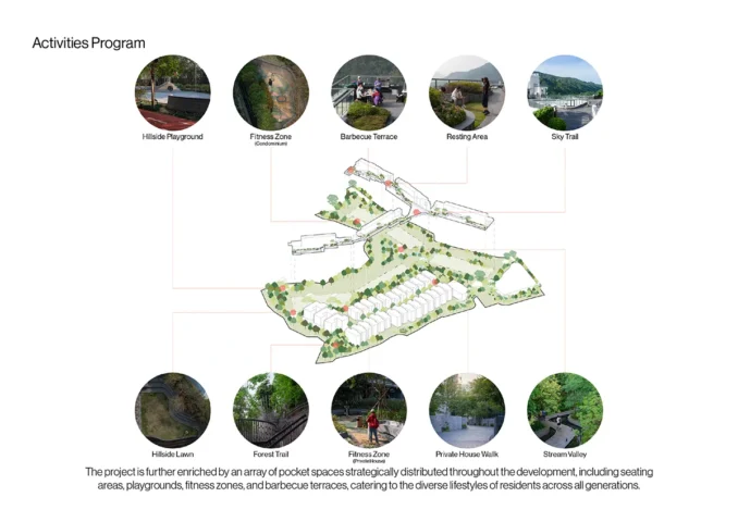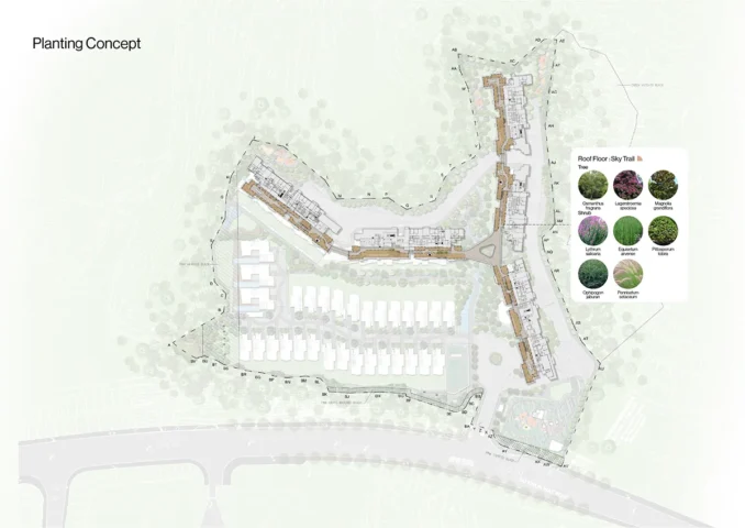 One of the challenges of this project lies in the site’s varying topography. Our design approach plays with dimensional space, incorporating a dynamic interplay of elevation changes through cascading water features and sloped pathways with an accessible gradient of 1:21, allowing smooth access to the arrival hall. The project is further enriched by an array of pocket spaces strategically distributed throughout the development, including seating areas, playgrounds, fitness zones, and barbecue terraces, catering to the diverse lifestyles of residents across all generations.