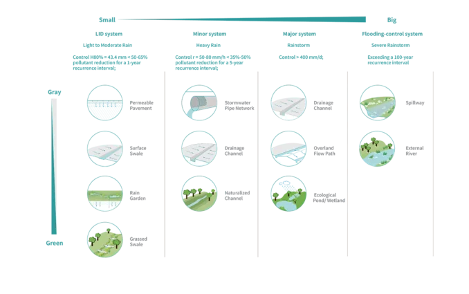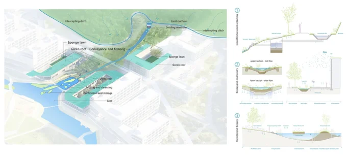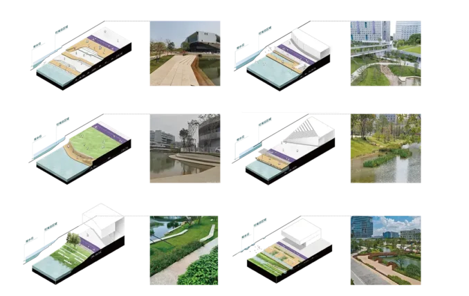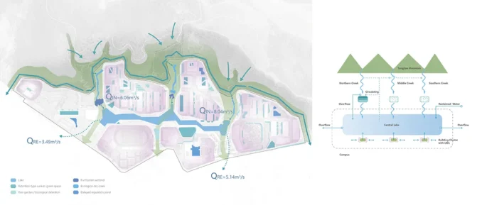 The reservoir has been transformed from a singular hydraulic function into a multifunctional blue core that works with decentralised “sponge” infrastructures across the site, effectively reducing impacts from extreme weather events and mountain flood surges (IMAGE4-1). They retain, infiltrate, purify and utilise stormwater, nourishing the greenery. Each year, more than 90% of the water needed by the lake and surrounding irrigation can be sourced from harvesting, with an average of over 72,000 m³ utilised. Meanwhile, the flood protection capacity in this area has been increased from a 20-year frequency to above a 100-year frequency. Beyond risk management, this framework creates a diverse habitat network and fosters a biophilic experience, integrating ecological connectivity within the academic environment.