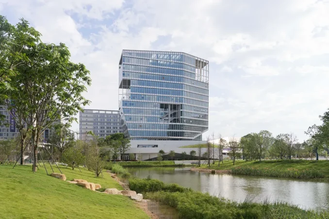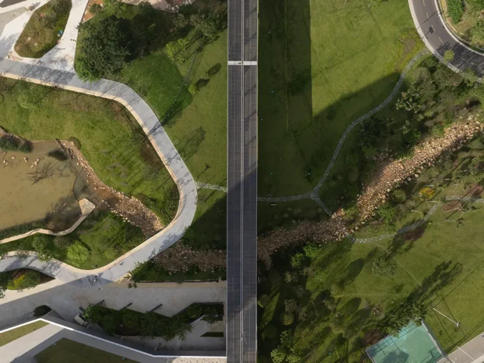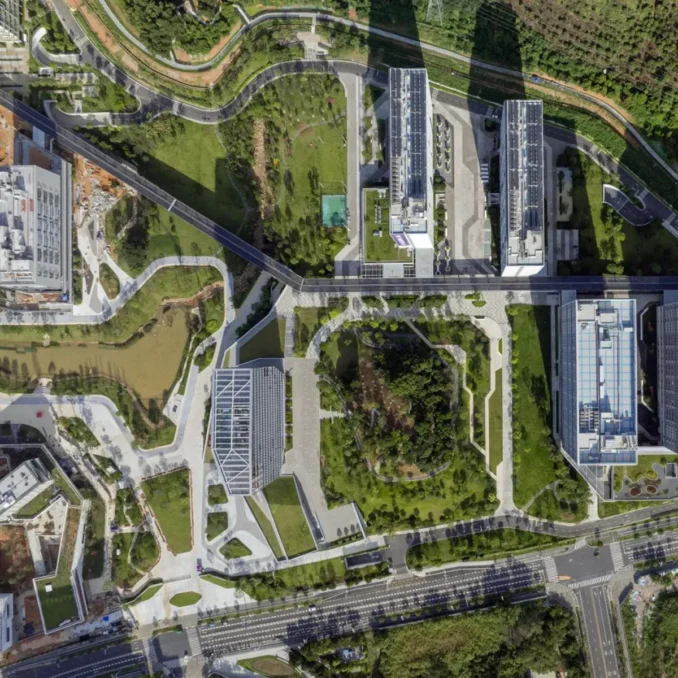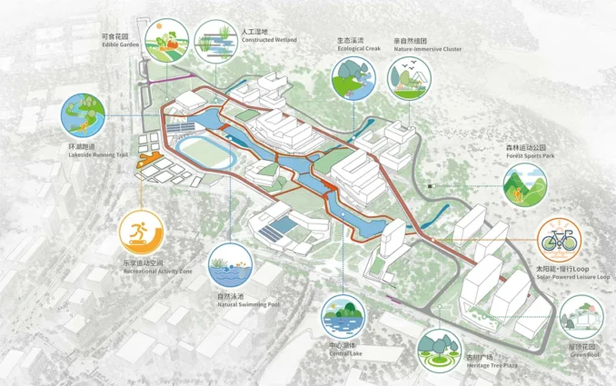 Along the lake extends an approximately 2-kilometre waterfront greenway, which integrates into building clusters and courtyards.