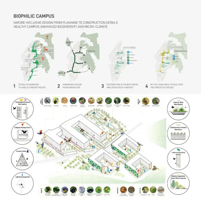 Deadwood by the lake, bird islands, and stone beaches create diverse habitats for amphibians and fish, transforming even in crowded human areas into places where plants and animals freely settle. We see the campus as a symbiotic interface between designed ecology and primary nature. By adopting a “nature-inclusive” approach, based on the possible orientation, height, and spatial needs of animals, the built environment offers shelter for birds, bats, and insects. Key native tree communities are deliberately preserved during the masterplan phase to showcase a low-impact urban development process.