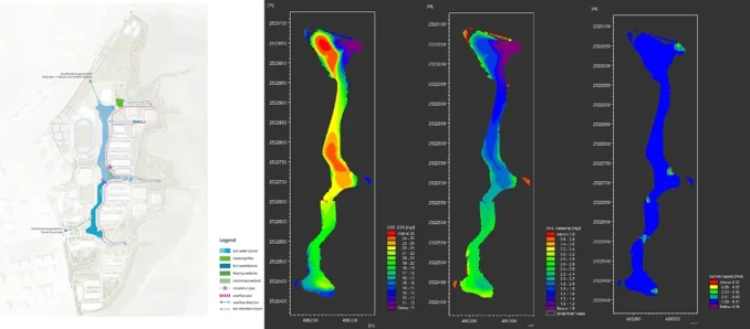 Three water-carrying creeks in ecological corridors seamlessly connect the mountain forest with the central lake. The resiliently variable area and water levels reveal this place as a distinctive and innovative water space. Water edges feature interweaving bio-engineered shorelines and floodable platforms . The central lake has a complete ecological circulation system ensuring excellent water quality.