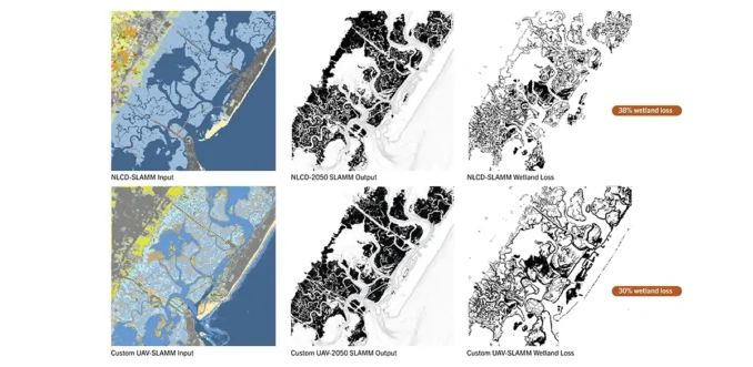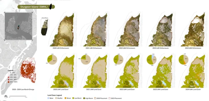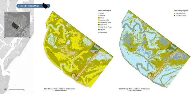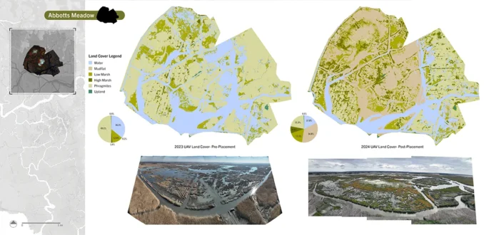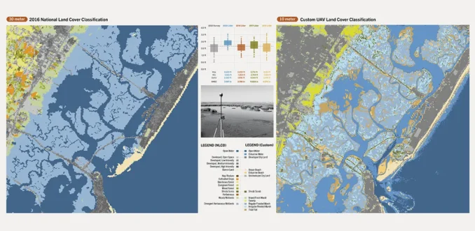 GPS-enabled drones, field survey receivers, and machine-learning algorithms enable novel methods to model and measure landscape changes. With these tools, we developed custom spectral libraries from field-collected data to create land cover maps at a “mesoscale.” The enhanced richness (resolution), reach (coverage), and return (frequency) of custom in situ data better capture the landscape characteristics needed for inputs into various models. These data and models are essential to determine material placement and profiles to support marsh viability. In addition, survey elevations taken from historical sediment placement sites were crucial for establishing target elevations to maximize the creation of high marsh habitats and optimize revegetation rates of low marsh areas. High marshes provide vital nesting sites and temporary refuge for key bird species during floods.
