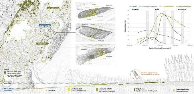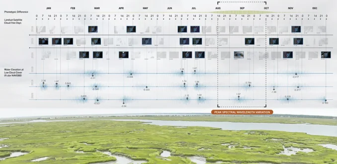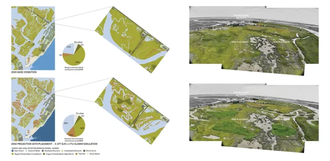 Our team will annually monitor each site to assess performance relative to modeled scenarios. The findings will serve as a blueprint for sediment placement techniques for landscape-scale restorations in other Atlantic Coast locations. Equipped with custom in situ remotely sensed data, designers can recover surveying as a central aspect of practice, contribute to new research frontiers, and participate in large-scale, interdisciplinary coastal infrastructure projects. J.B. Jackson understood that landscapes constantly evolve, but we no longer live in the temporal context he assumed. Landscape architecture is one of the few fields that offer ways to negotiate the misalignment between historical time, human experience, and the planetary time of global heating.