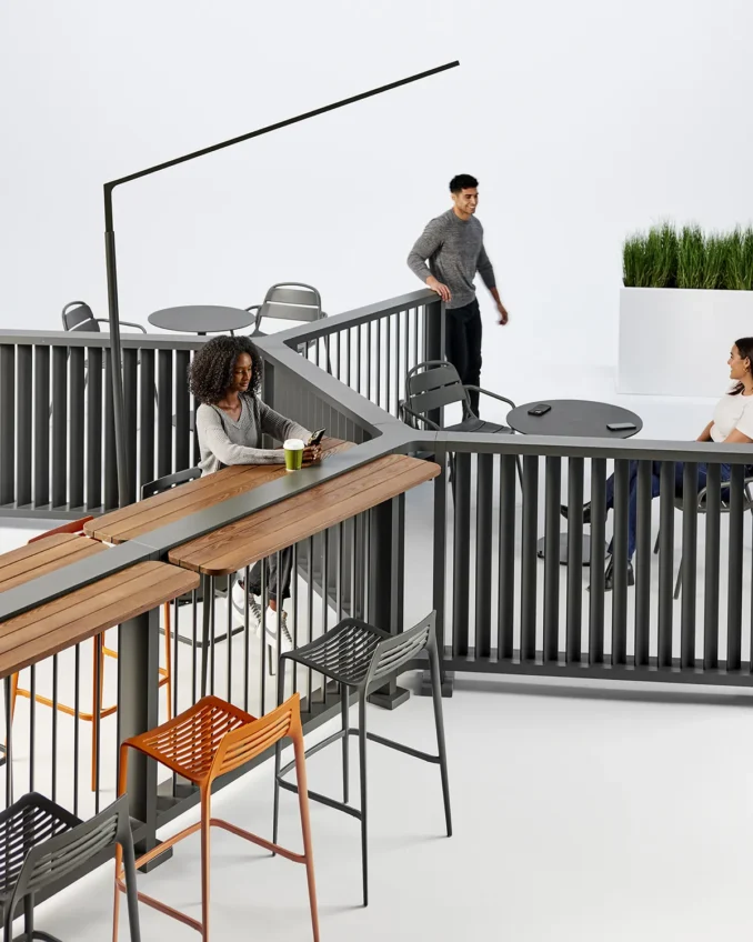 Accompanying Backdrop’s panels is a collection of accessories to truly tailor the configuration. Integrated peninsula or in-line tables in standing or dining height create comfortable spaces for a meal, work, or conversation. Wood or metal bar tops placed on bar-height panels create casual, two-sided seating. Configurable bike racks, coat racks, and shelving units offer convenient storage for personal items, and inline benches provide additional seating.