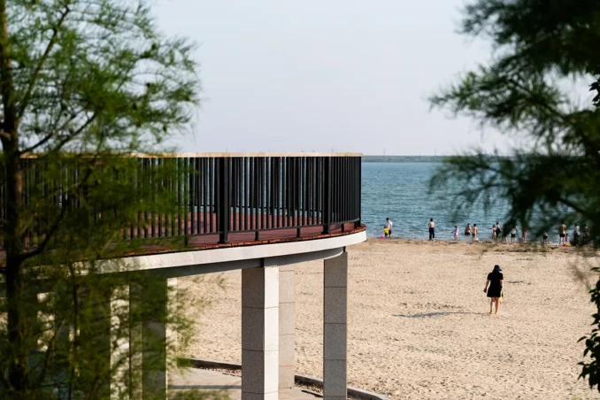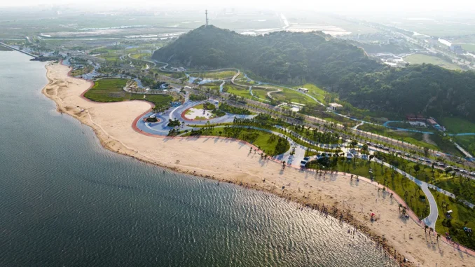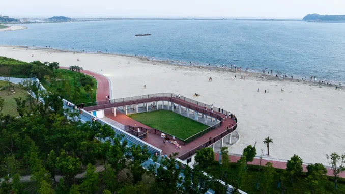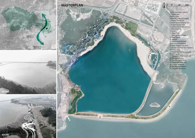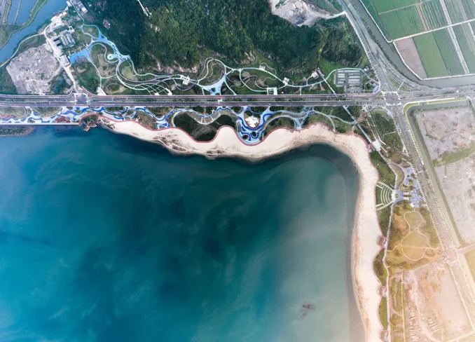 Baisha Bay, serving as the estuary to Taizhou Bay and located at the Mentou Port of Linhai City, Zhejiang Province, is an arc-shaped bay nestled between Beiyangtu and Nanyangtu. Baisha Bay Park is a transformative design that integrates the bay’s inner waters and a 2.5-kilometer-long artificial sandy beach with the area’s natural advantages, including abandoned silt tidal flats, reef-surrounded mountains, Baisha Mountain, Dadao Mountain, and the bedrock shoreline.