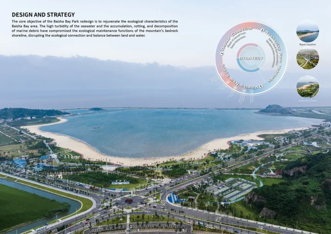 The core objective of the Baisha Bay Park redesign is to rejuvenate the ecological characteristics of the Baisha Bay area. The high turbidity of the seawater and the accumulation, rotting, and decomposition of marine debris have compromised the ecological maintenance functions of the mountain’s bedrock shoreline, disrupting the ecological connection and balance between land and water. The presence of saline-alkali soil in the coastal area further inhibits plant growth, resulting in a lack of forest cover to protect against the frequent typhoons in summer, which hampers the ecological restoration and stability of the Baisha Bay area.