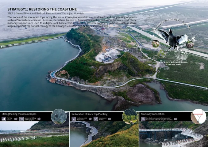 The design retains the mangrove wetlands in the abandoned muddy tidal flats in front of the sea dike, facilitating mangrove rehabilitation while adding lightweight boardwalks to reserve space for mangrove growth. Vegetation such as Casuarina equisetifolia and Suaeda heteroptera Kitog is planted to reshape the coastal environment with bio-affinity, attracting birds like Fulica atra to rest and nest. The slopes of the mountain tops facing the sea at Chuanjiao Mountain are reinforced, and the planting of plants such as Pennisetum setaceum ‘Rubrum’, Oenothera biennis L., Cosmos bipinnatus, and Iris lactea is restored. Stone masonry supports are used to mitigate rock base erosion caused by extreme weather conditions such as storm surges, repairing the natural ecology of the Chuanjie Mountain and bedrock shoreline area. Considering the existing sandy shoreline in front of Dadao Mountain can lead to dry beaches, the design incorporates a combination of dry and wet, using coarse sand on the upper layer and fine sand on the lower layer to repair the shoreline beach structure and create spaces conducive to seaside living.