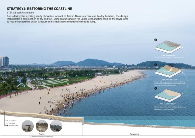 The ultimate goal of the project is to restore the ecological features while introducing spaces for coastal urban tourism and living. The site, enclosed by Baisha Mountain, Dadao Mountain, and Chuanjiao Mountain, has seen its original 300-meter sandy shoreline transform into a muddy beach due to long-term tidal flat cultivation and other activities. The increased stickiness of the tidal flats after rain further impedes pedestrian access. Transforming the abandoned muddy tidal flats and the bedrock mountain areas in front of the sea dike into public interactive spaces suitable for urban tourism and living is another key aspect of the renovation project.