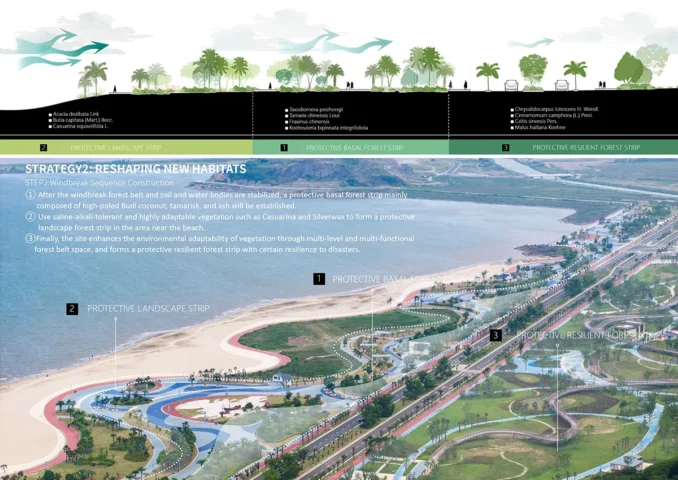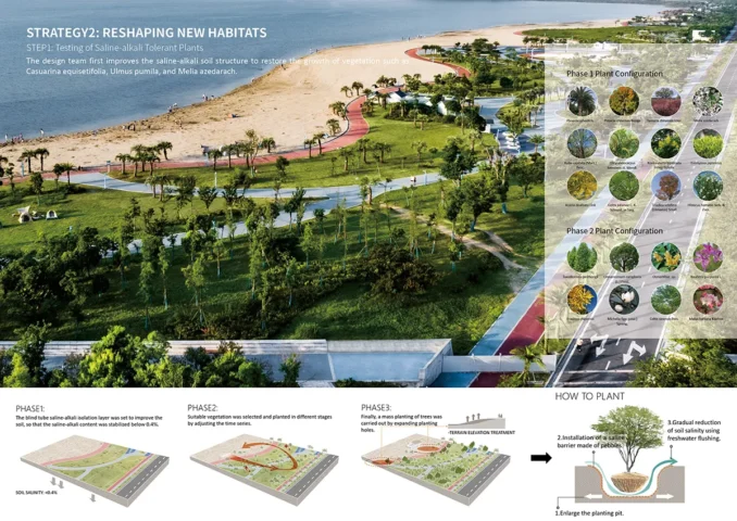 The design team first improves the saline-alkali soil structure to restore the growth of vegetation such as Casuarina equisetifolia, Ulmus pumila, and Melia azedarach. Then, on the high slopes, protective forest belts are formed with salt-tolerant and adaptable species such as Casuarina equisetifolia, Quercus virginiana, Acacia dealbata, and Sabina chinensis (L.) Ant. cv. Kaizuca. After the windbreak forest belts and soil water body stabilize and form different habitat spaces, a protective landscape forest belt mainly composed of Butia capitata (Mart.) Becc., Taxodium mucronatum, Tamarix chinensis, and Fraxinus chinensis is established. Ultimately, by developing layered and multifunctional forested areas, this approach enhances the vegetation’s ability to adapt to its environment. This results in a robust forest belt capable of withstanding certain disasters, bolstering the area’s resilience against ecological threats.