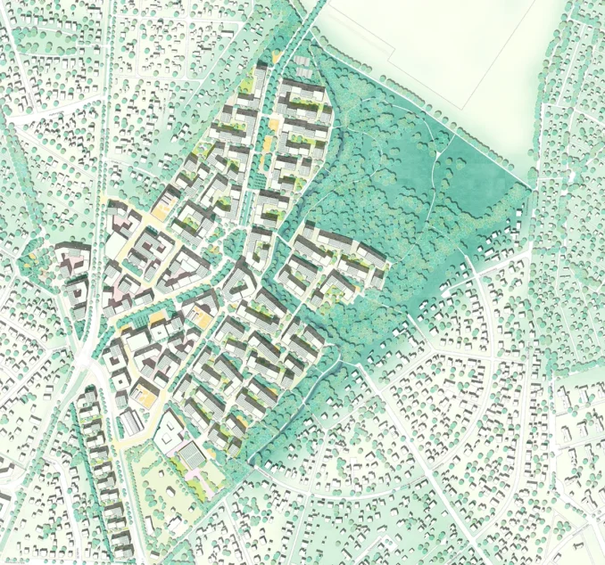 The teams’ task was to develop an overall concept for the development of a vibrant, mixed-use, socially diverse neighborhood with high ecological and open-space planning quality. Affordable and attractive housing, forward-looking commercial buildings, and recreational facilities are to be built. A new school and several daycare centers are also planned. The neighborhood combines wooden modular buildings with conventional construction techniques to create high-quality urban spaces, reduce housing costs, and minimize CO2 emissions.