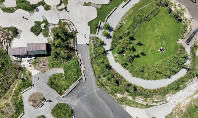 Bridgefoot Street Park is a unique spatial composition, which uses construction and demolition waste, in the form of secondary raw materials, to create Ireland’s first such permanent public space. The new one-hectare park in Dublin’s city centre addresses global environmental challenges in a synthesized and beautiful way, laying the foundation for aesthetic and even legislative change in Ireland. Over 2,000m³ of what would have been waste were creatively redirected away from landfill, the embodied energy now permanently contained within the park.