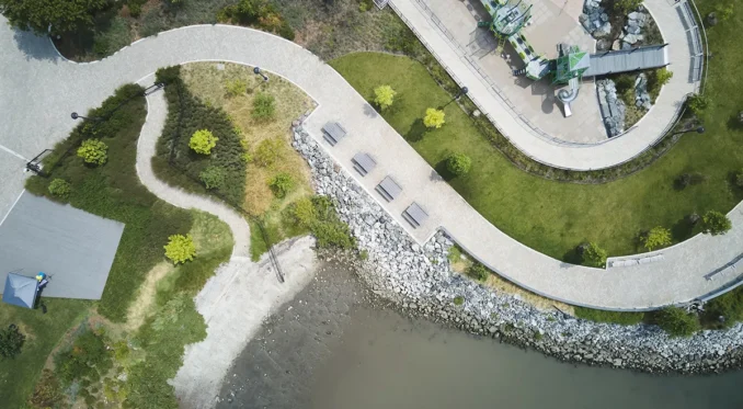 The project features a resilient shoreline edge, removing an existing relieving platform and creating a more naturalized shoreline slope that can reduce tidal energy as sea levels rise. It reintroduces native tidal marsh vegetation and employs a planted revetment strategy that both stabilizes and ecologically enhances the shoreline edge.