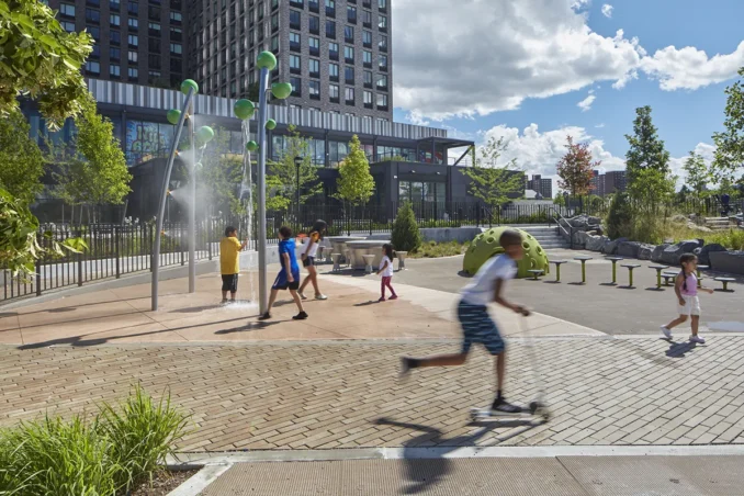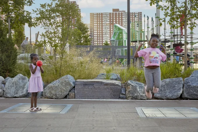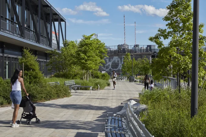 Bronx Point is a new, civic-minded public space that aims to reconnect the broader Bronx community to the Harlem River waterfront. The project reclaims a previously inaccessible 6.8-acre stretch of the Harlem River, introducing a 4.6-acre public park and waterfront esplanade. Paired with a mixed-use building that includes 540 units of 100% affordable housing and a landscaped residential terrace, the design weaves together public space and housing in a unified, human-centered waterfront experience. The building will also be home to The Hip-Hop Museum — the first museum in New York City dedicated to the history and evolution of hip-hop, which originated in the Bronx. Slated to open in 2026, the museum will act as a cultural anchor, offering community-based programming. The park’s design includes a nature-themed playground, a get-down path for educational access to the river, and a variety of recreational amenities. At Exterior Street, a flexible plaza space serves as both a welcoming gateway and a venue for seasonal events, further activating the site throughout the year.
