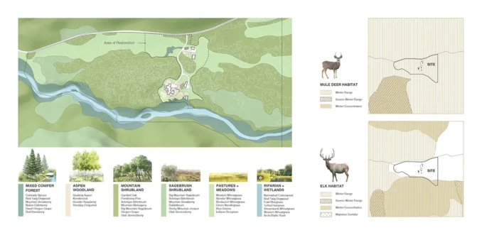 During the planning process, an independent wildlife ecologist and representatives of Colorado Parks and Wildlife were called in to evaluate wildlife patterns and identify river and stream corridors and wetlands. Their report verified that decades of land disturbance from farming and ranching had not significantly impacted wildlife habitat on the project site. Furthermore, they found that, while the adjacent stream corridor and riparian woodlands provide rich winter habitat for elk and mule deer, any new development that occurred within the same footprint as previous structures, would not negatively impact the animals, their habitat features, or jurisdictional wetlands. As an extra precaution, the landscape architect specified additional native trees and shrubs between the ranch and migratory routes to minimize potential impacts.