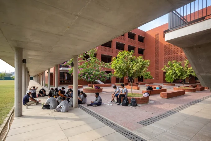 The campus is anchored by a large central Maidan, a large tree-lined field and the spiritual and social anchor of the site which is surrounded by a series of smaller courtyard gardens and linked by a continuous colonnade. These outdoor spaces are more than amenities, they’re integral to the educational model, providing areas for outdoor learning, reflection, sport, and social interaction.