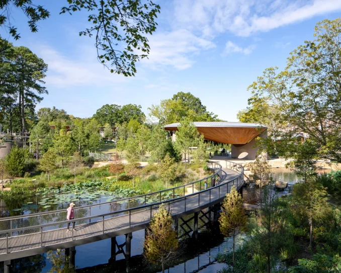A series of outdoor rooms are interconnected by multi-dimensional vantage points, including elevated walkways, meandering paths, and water features. Three pavilions provide year-round gathering spaces and contribute to the park’s financial sustainability. Key areas include a plaza with a pavilion and interactive water feature, an inclusive children’s play environment, a flexible great lawn for large community gatherings, and a gathering house and garden for special events and quiet contemplation.