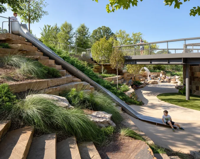 The park’s circulation design connects and extends activities across all ages and interests. Utilizing a 30-foot grade change, elevated walkways visually and physically link the distinct park rooms. Water management and sustainability are addressed across the topography. Positioned at the top of an important urban watershed, green infrastructure is implemented for both performance and enjoyment. A series of water features, swales, and rain gardens create a public amenity where visitors can interact with water throughout the park. The on-site water detention pond collects runoff and alleviates downstream capacity stresses, detaining water to 500-year levels during peak demand conditions and protecting floodplain functions. This natural pond replaces concrete culverts that previously displaced water offsite, causing downstream neighborhoods to flood.
