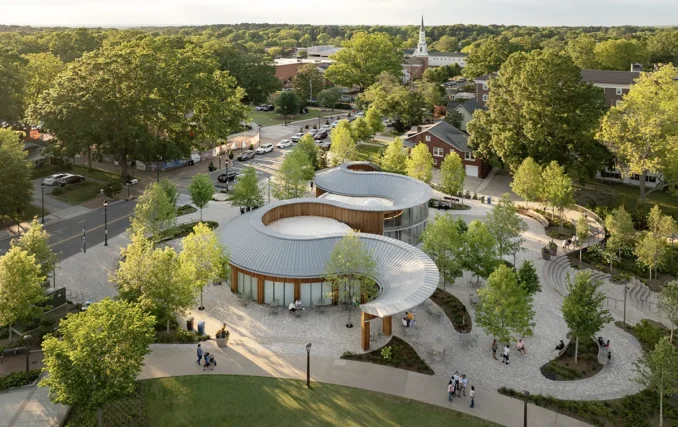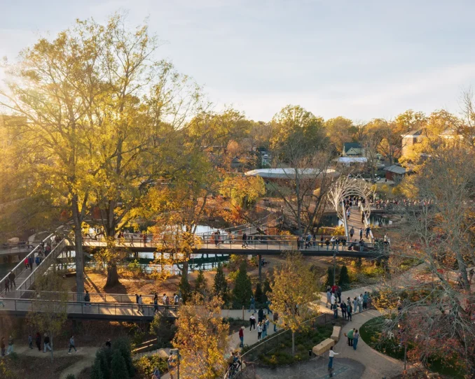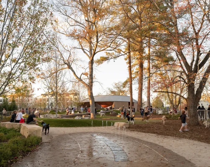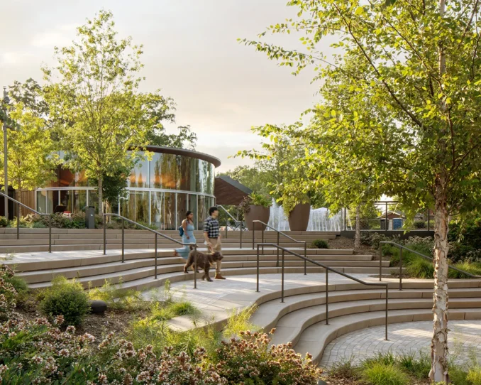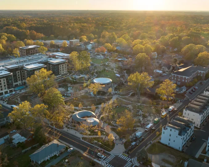 Downtown Cary Park is a vibrant 7-acre public park in North Carolina serves as a hub for recreation, relaxation, and social gatherings, revitalizing the downtown business district. The park’s comprehensive sustainable framework highlights the native ecologies of the Piedmont region and employs green infrastructure solutions to address persistent flooding issues. Nature-based play areas and natural systems are integrated throughout the park.