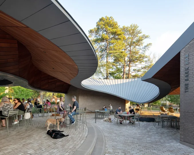The Academy Plaza Pavilion offers comfort amenities and event space, along with a unique market concept providing park-goers access to snacks and sundries. The Bark Bar is an open-air, all-season pavilion offering libations in the park, adjacent to an off-leash dog area featuring play mounds and water features. An undulating roof creates covered outdoor seating and provides restroom amenities for park patrons. Another pavilion offers rental space for community and private events. The park’s calendar includes core programs held weekly, a rhythm of monthly and special events, and seasonal activities to draw people outdoors year-round. Collaborative partnerships have been key to early success benchmarks. In its first year of operation, the park welcomed over 750,000 visitors, establishing its prominence as both a local and regional attraction and generating revenue well ahead of its stabilization plan.