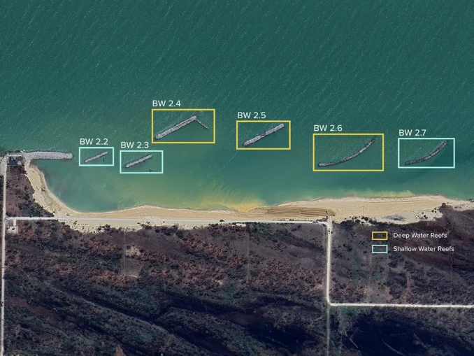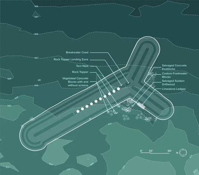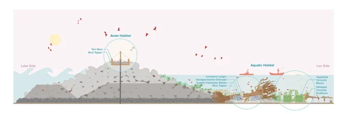 The breakwater structures hold the right lake position for Tern habitat and when enhanced with custom nest structures, the breakwaters have the potential to provide important new breeding locations for the Terns while simultaneously working to minimize loss of beach shoreline and create lower energy conditions on the shoreline side of the breakwaters. This new littoral habitat offers valuable new angling and bird watching opportunities for park visitors.