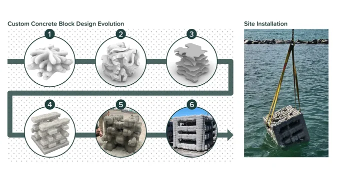 The team’s coastal engineers modeled and formulated 22 habitat islands in the form of breakwaters and submerged reef structures, positioned out in the lake rather than building armoring directly along the shoreline. Given the sensitivity and ecological value of this location, a thoughtful analysis of construction methods aimed at a reduction in potential impacts to the delicate ecosystems onshore and offshore was part of the planning from the onset.