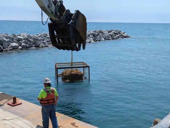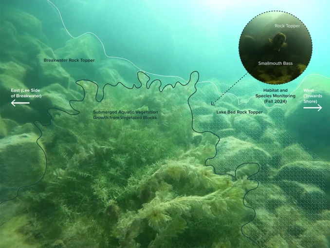 Late summer monitoring was conducted three months after the habitat elements were installed. Establishment of significant aquatic plant growth from the vegetated blocks positioned on the lakebed mid-June of 2024 demonstrated the benefits of the quieter shoreline condition that would allow for plant growth in such a high energy lake. A handful of native fish species have already been observed using the aquatic habitat elements.