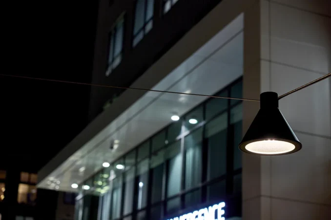 The multi-head high output configuration at 25′ provides ample illumination to roadways and crosswalks, while a single luminaire at 12′ softly illuminates a pedestrian path. In between, lens heights at 14’, 16’ and 20’ help designers tailor light to site to achieve the optimal visual experience. In wall mounted scenarios, Moment’s minimalist profile serves to complement both contemporary and historical architecture, while the pleasant geometry of the luminaire on catenary wire adds vibrancy to walkways, passthroughs and building alleys, transforming them into catalysts for elevated outdoor urban experiences.