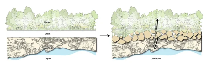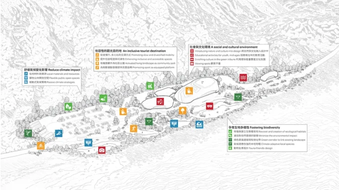 MVRDV’s masterplan replaces and enhances the old infrastructure while strengthening the park’s natural character. All new development will be limited to already built areas to prevent disturbing the original natural landscape. Inspired by the layered shapes of the coastline, the design disrupts the straight road and reimagines recreational paths as a cracked, rocky, naturalistic terrain that reconnects the forest and coastline. The rock-like fragments create different zones for circulation and public use, with some protruding into buildings that reflect the natural features of local rock formations, seamlessly blending into the environment.