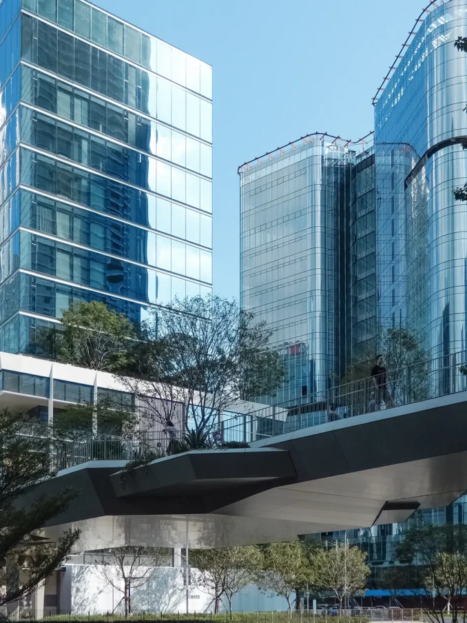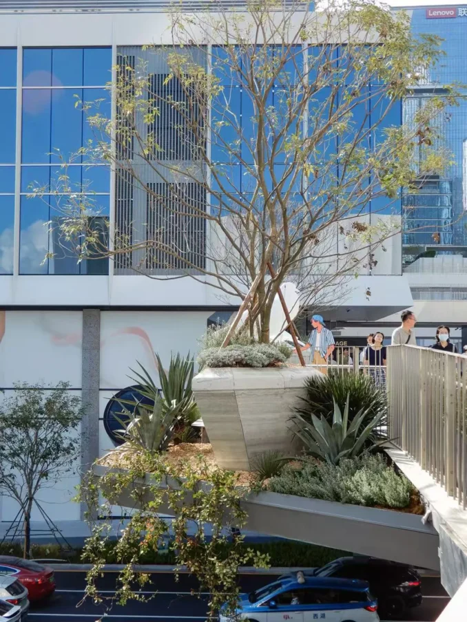 A signature feature is the 1km-long Elevated Walkway, a bold piece of green infrastructure that has become an icon of the Shenzhen Bay MixC masterplan. Designed as both infrastructure and experience, the distinctive walkway integrates rest areas, planters and viewing decks, providing seamless connections between transport hubs, retail environments, and cultural venues. This multi-level connection blurs the boundaries between architecture and landscape, forming a continuous tapestry of landmarks and public spaces that enrich visitor experiences while enhancing connectivity across the district.