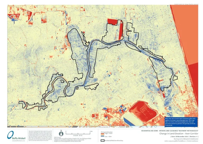 Approximately 8,000 properties and dwellings were identified as being located on 630 hectares of land deemed infeasible for rebuilding. This was the Red Zone.