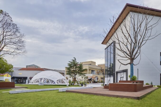Located in the northeast of the river, Buildings B9 and B10 had previously been isolated from the mall’s main circulation routes. The renovation of the riverside and the former children’s playground created visual continuity with the surrounding spaces, clarified pedestrian circulation, and opened up sightlines, thereby repositioning the area as a strategic focal point. The buildings were redeveloped into flagship stores for sports brands, supported by an open lawn plaza in front that now serves as an outdoor event venue.