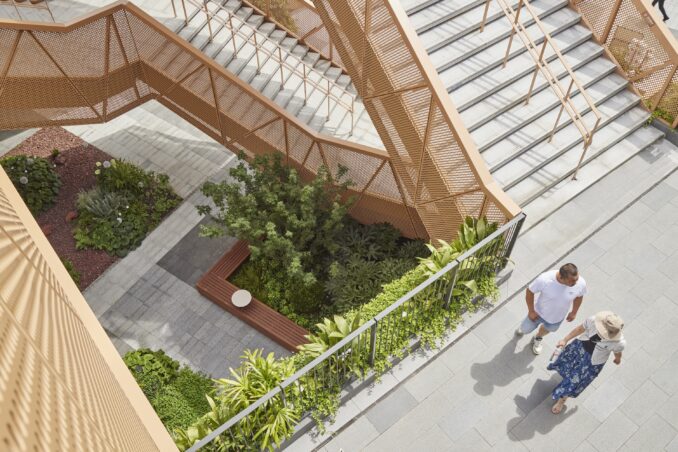 One of the defining features of the new building is the pale orange outdoor staircase. The adjacent event plaza and its shaded subspace have been landscaped with lush greenery, creating a pocket-park–like oasis.