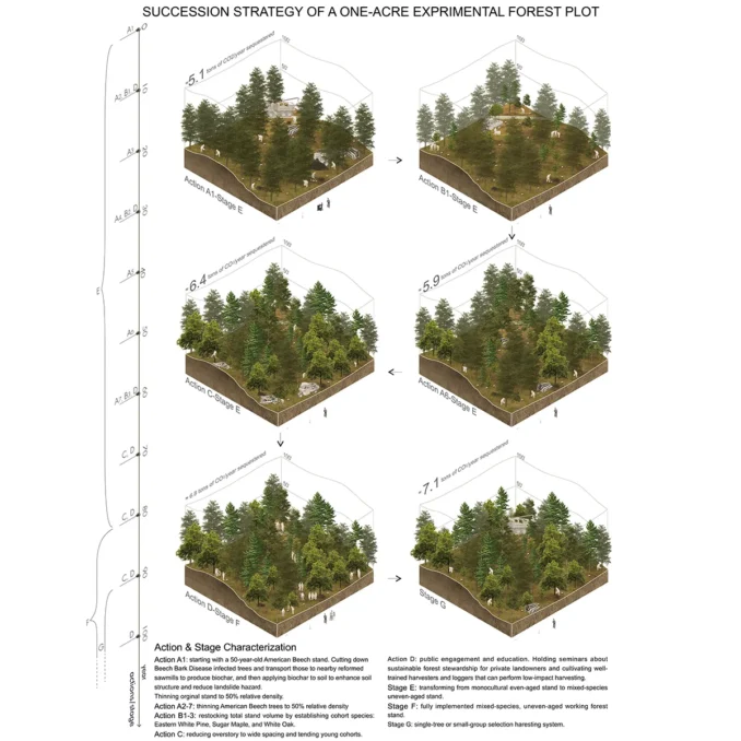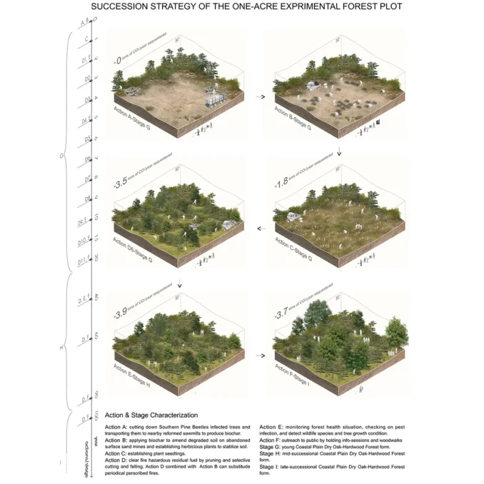 Finally, in the experimental forests, I purposed succession strategies to demonstrate how those disturbed forests regenerate, and I calculated the carbon performance of the two one-acre experimental forests in each stage to show how much carbon a tract of healthy forest can absorb and store, and to reveal the potential of forest carbon performance in the Green New Deal context.