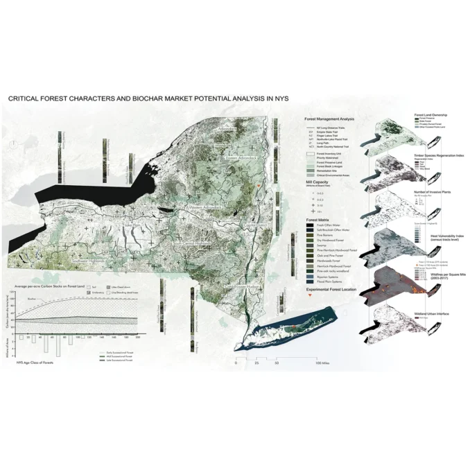 Exploring New York State (NYS) forests, I found that the forests are facing issues like lessening early and late forest successions, certain species’ insects and diseases, and wildfire and landslide hazards. These closely connected to forest health, functioning, and carbon performance. On the other hand, the state has great potential to develop biochar market based on existing sawmills, which will benefit for forest structure improvement when combined with sustainable forest stewardship.