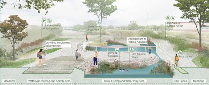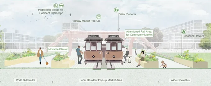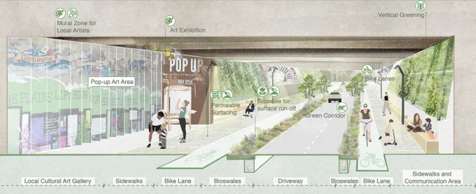 - Hard-Surface Spaces: The space under elevated highways is transformed into a “lowline corridor” using pop-up art markets, local murals, and green planting areas.