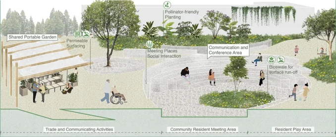 - Parks: Small pocket parks are created as “welfare pockets,” offering community members a space for social interaction and activities.