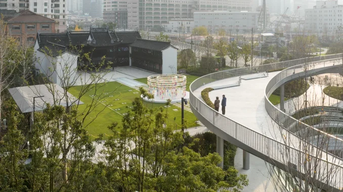 The site of Suzhou River Park was originally comprised of several disjointed blocks separated by a busy road. To create a cohesive park experience, the landscape design utilized a unified design language to connect the different blocks with pedestrian bridges.