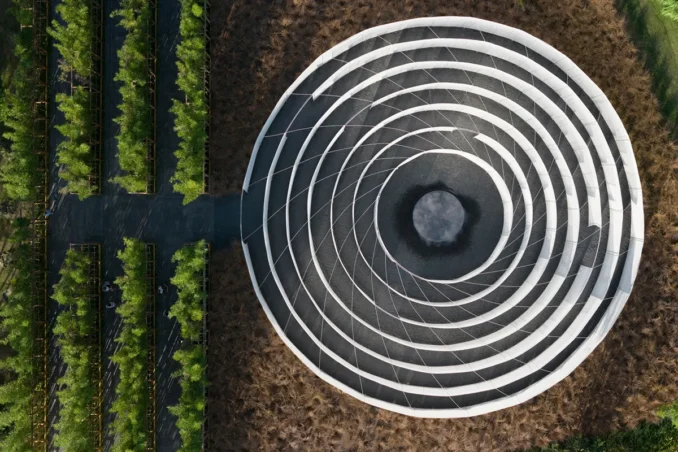 Bamboo is a plant that symbolizes humility and tenacity. If we cut open a bamboo pole or lantern in imagination, the inside would be empty, while the outside would be a round, layered surface. The structure of the garden derives from this image of a “Lantern.” It consists of layers of white nylon mesh that form seven concentric circles. The plan is shaped like a cut bamboo. Layers of pattern and shadow surround the center of the garden, where there is a glowing mist, the light of the Lantern.