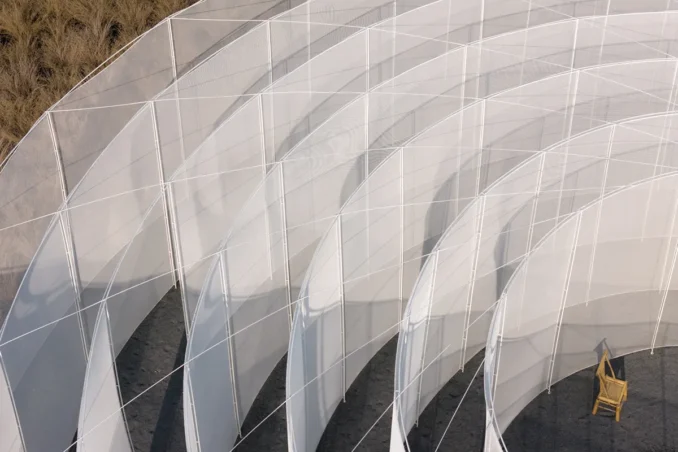 The main materials overall consist of bamboo scaffold framework, the metal structure of the labyrinth, the vinyl mesh attached, and the surrounding bamboo bundles which are all environmentally friendly and renewable materials. The concentric circles are made of white nylon netting secured to a slender metal frame. Bamboo scaffolding serves to hold the timber bamboo in place during high winds and hollow bamboo sections at the end of each hedgerow form water bottle racks.