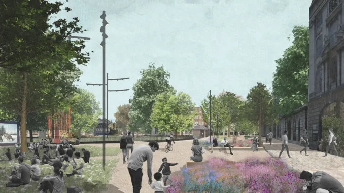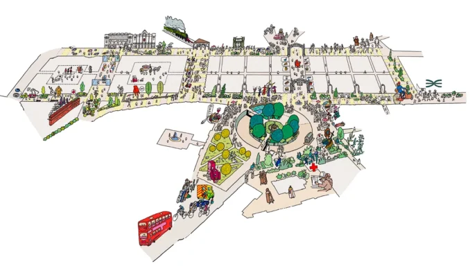 Dominated by car traffic and service vehicles, the area is being redefined as a network of streets where walking, cycling and public life take precedence. Guided by the Healthy Streets approach, we reduce through-traffic and on-street parking, maximise car-free areas, expand footways and improve cycle infrastructure to create a permeable, people-first environment.